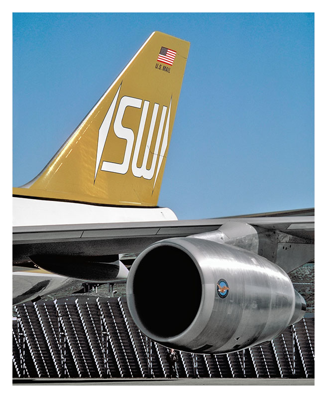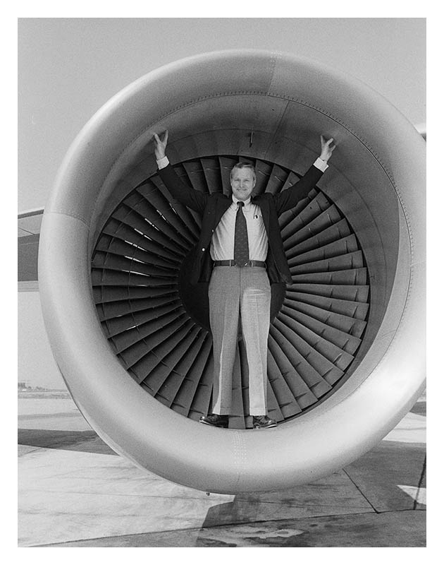 N703SW is seen here with the Pratt & Whitney JT9D-70A engines. With 53,000 lbs. of thrust, it was the most powerful jet engine in the world at the time of its introduction into commercial service. It first appeared on 703's sister-ship, N702SW, in May 1976. N702SW was the test-bed aircraft used for certification of these engines. The nacelle's sleek profile and elliptical cowling sometimes caused it to mistaken for a GE engine. Click here for another view of this engine. This photo, showing Capt. Ed Foster standing in the inlet, gives an indication of the size of the engine.