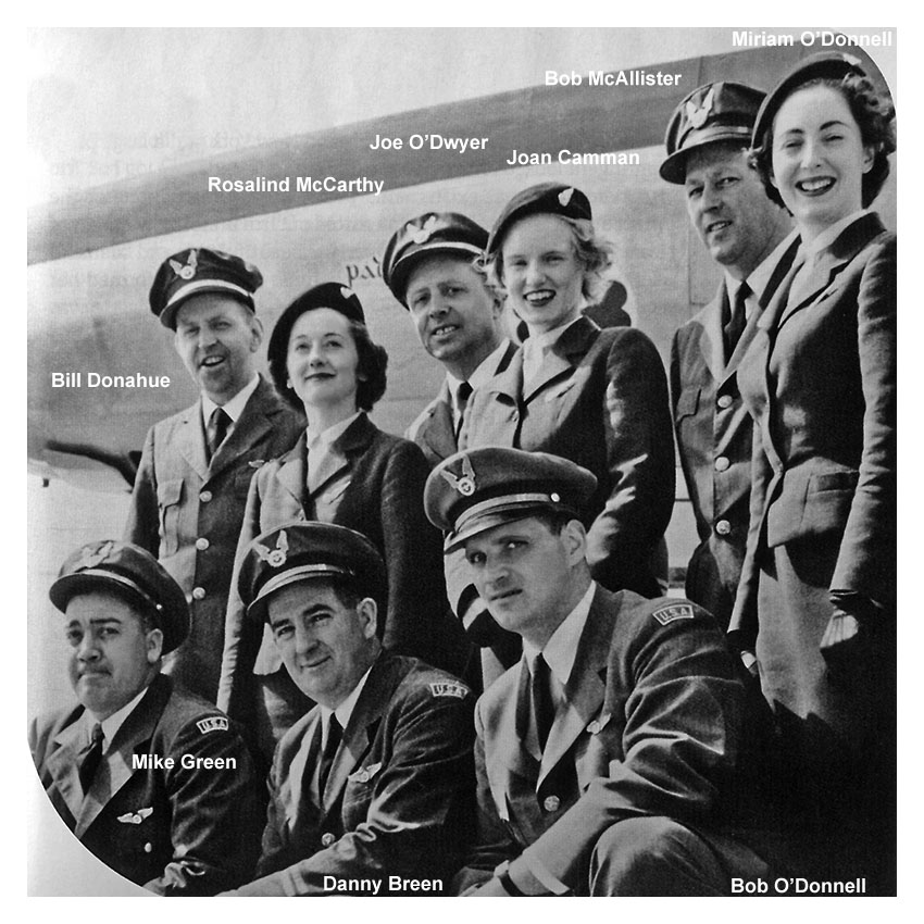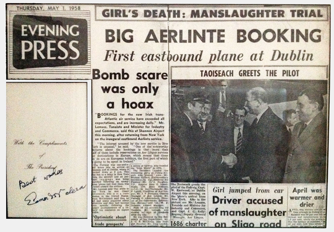 On Saturday, April 26, 1958, a Seaboard Super Constellation landed in Dublin to begin Aer Lingus' trans-Atlantic service two days later. The event was the lead story on the front page of Saturday's Evening Press newspaper. The cockpit crew comprised Capt. Bill Donahue, Relief Capt. Joe O'Dwyer, F/O Bob McAllister, Flight Engineers Bob O'Donnell and Danny Breen; and Navigator Mike Green. Aer Lingus supplied the flight attendants; Chief Aer Lingus hostess Miss Rosalind McCarthy, Miss Joan Camman, and Miss Miriam O'Donnell. The crew is seen in this photo. As Irish a crew as one could find.The passengers were Robert Wagner, mayor of New York City; a State Department official, general manager of Aer Lingus, other officials, 30 American reporters, and 40 travel agents. After takeoff, Capt. Donahue serenaded the passengers by singing Kevin Barry over the p.a. system. Enroute, the aircraft had an engine failure and made an unscheduled landing at Gander. After discharging the passengers, the aircraft ferried back to New York on three engines. After an engine change, the flight resumed and finally landed in Dublin. Waiting at the airport was a large crowd, including 50 reporters, photographers, and television news people. The inaugural eastbound flight was flown by Capt. Bill Eastwood, and landed in Dublin on May 1. They were greeted by the president of Ireland, Éamon de Valera, seen in this newspaper photo, shaking hands with Capt. Eastwood.
