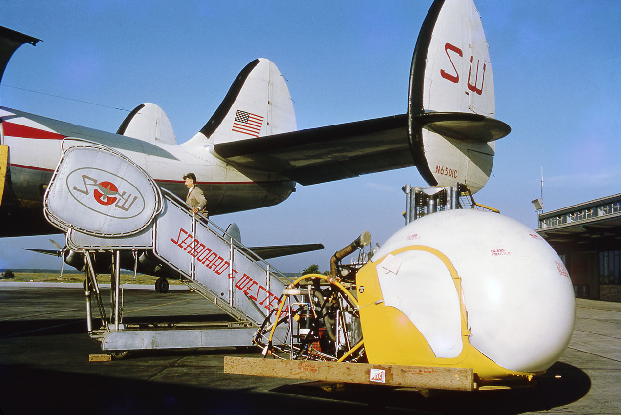 Loading part of a Bell 47 helicopter onto a Connie.
