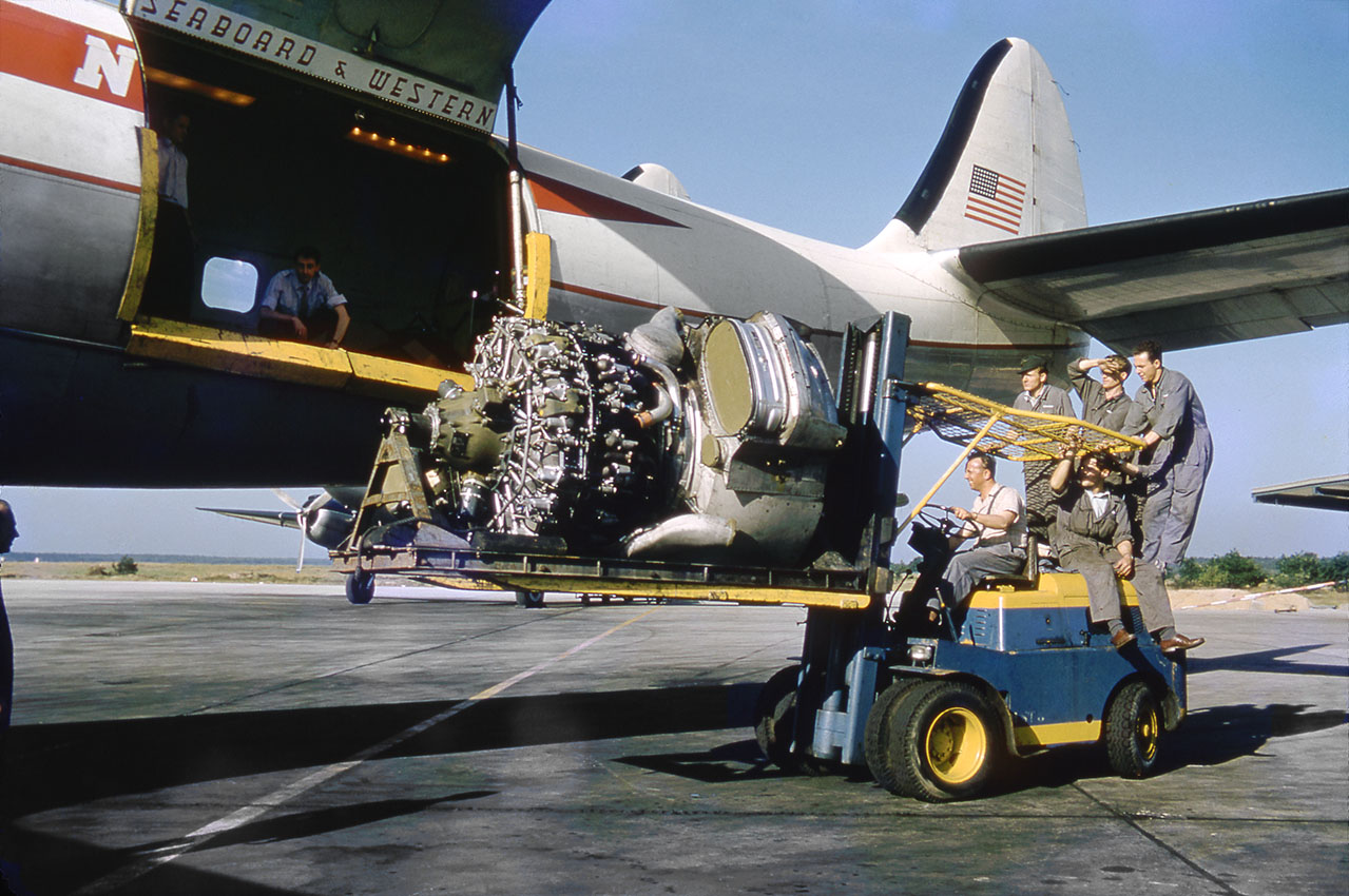Loading an 18-cylinder Wright R-3350 Turbo-Compound engine, probably for a Connie, onto a Connie.