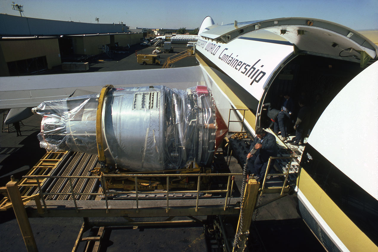 Loading a Rolls-Royce RB211 jet engine for a wide-body aircraft onto a B-747.