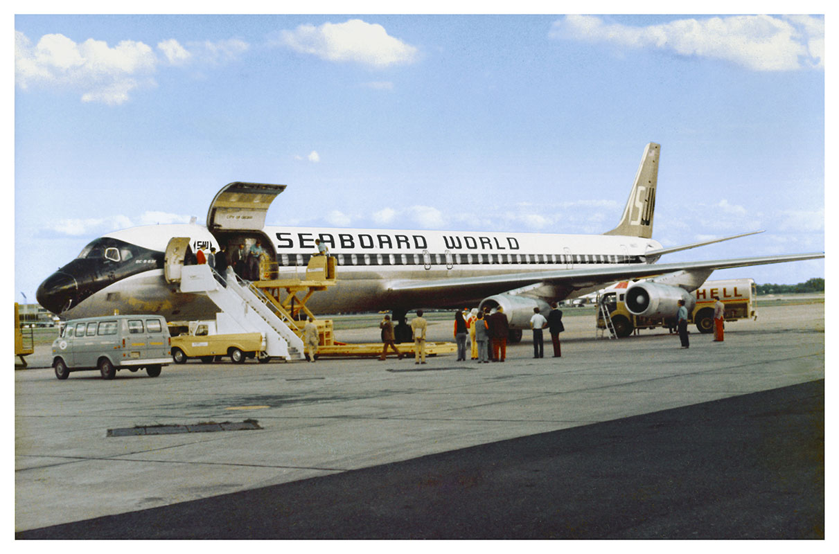 Loading a particularly long piece of freight onto a DC-8