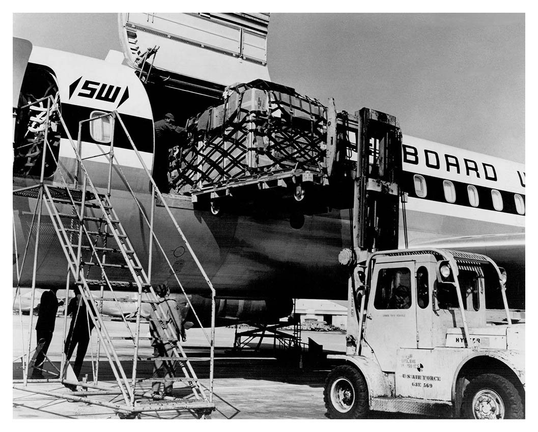 Loading a DC-8 with a forklift at a U.S. Air Force base.