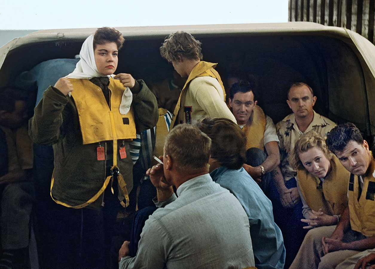 Flight and cabin crewmembers in ditching training, during the late 1950s or early 1960s.