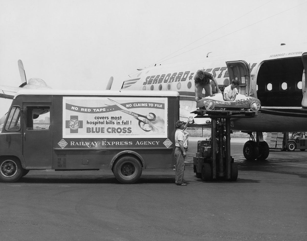 Winner of 1956 Irish Soap-Box Derby being unloaded at Idlewild after a flight from Shannon, Ireland.
