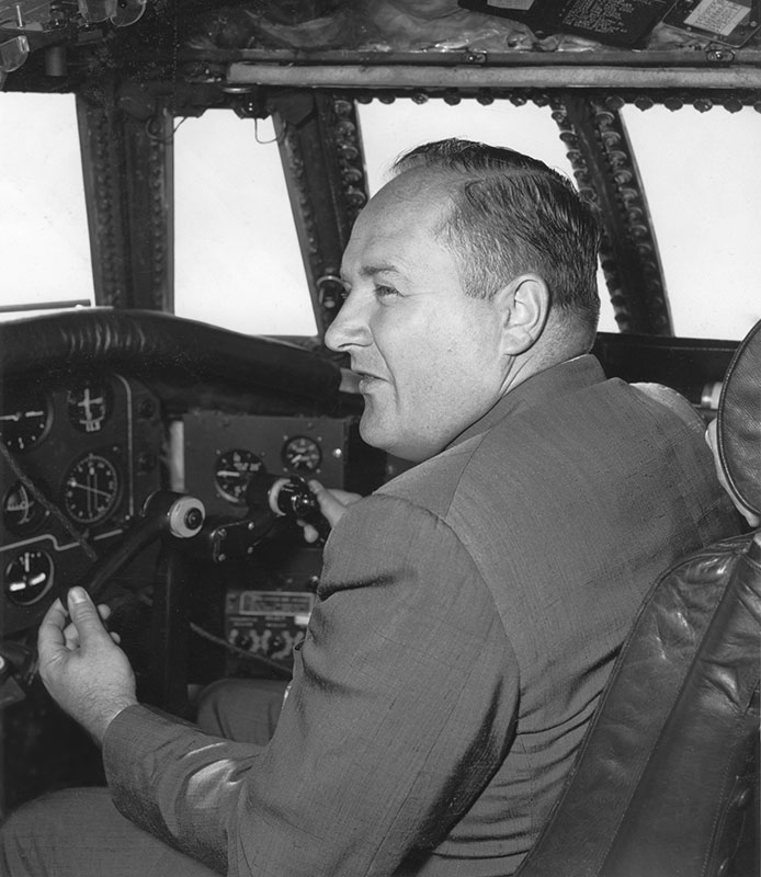 Here, Carl Brell, Seaboard's Vice-President Operations, is seen flying a Britannia at the Bristol Aeroplane Company plant in the U.K.