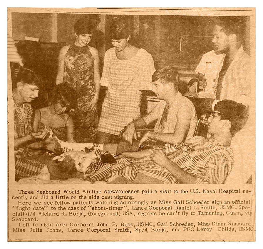 Flight attendants Gail Schoeder, Diane Stannard, and Julie Johns visited the U.S. Navy hospital in Guam.